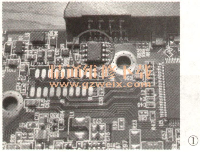 拆開主板,發(fā)現(xiàn)+12V供電支路中的D4和R63均已燒毀,估計是供電異常造成的故障。由于不知道燒壞元件的具體型號,加之供電問題易導(dǎo)致DC/DC電路損壞,于是網(wǎng)購?fù)姹咎枺ù擞脖PPCB板版本號為2060 -771824 -005REVP1)的二手拆機(jī)板。因每塊硬盤固件不同,則拆下原板上存儲固件程序的閃存U12(PM25LD020、2Mbit),然后裝到購買的主板上,如圖1所示。接入電腦試機(jī),故障排除。