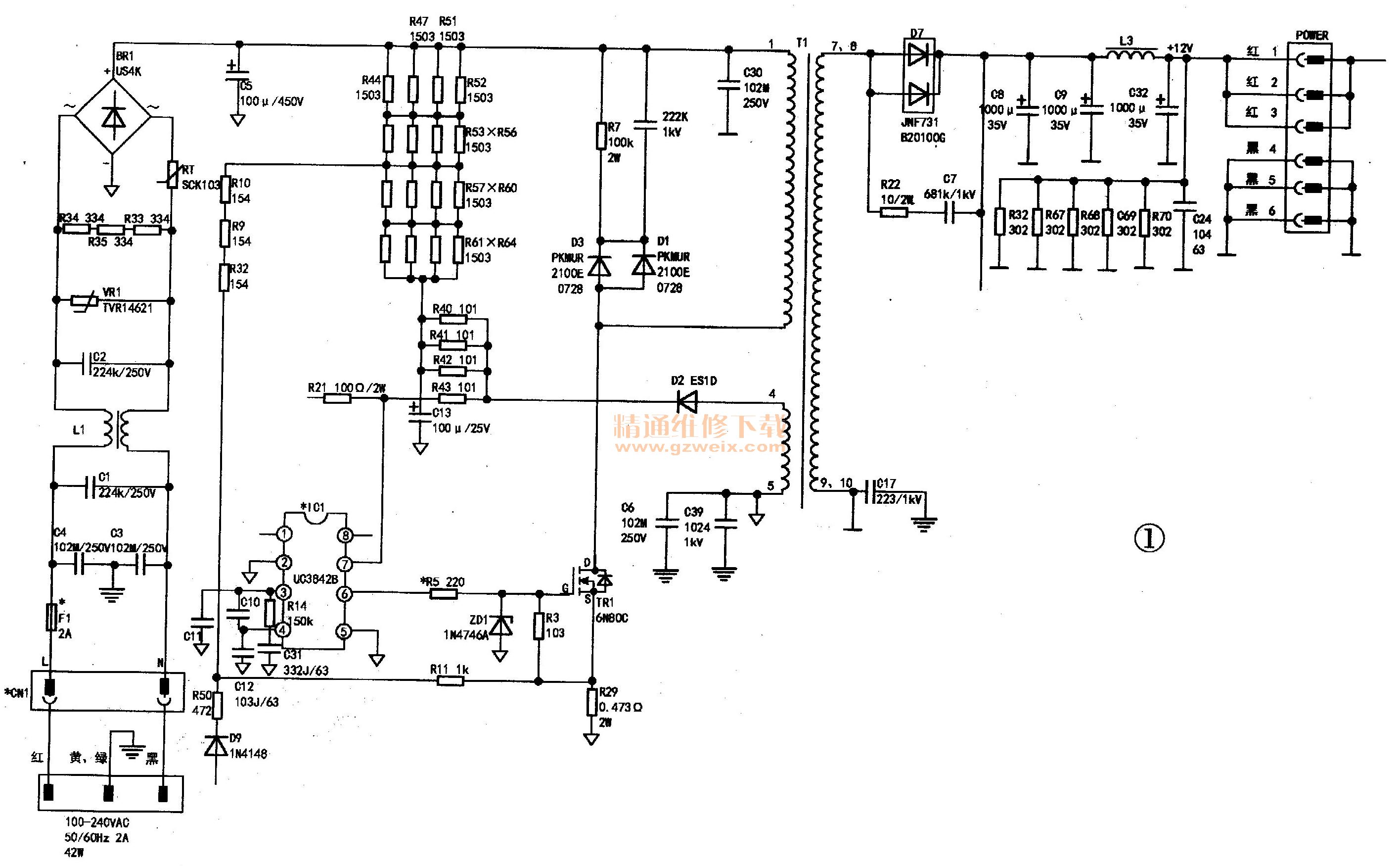代換IC 1(UC3842B)、R5(22Ω)后空載通電,測(cè)接插件POWER紅、黑線針腳之間電壓為++12V,復(fù)原后試機(jī),一切正常,至此,故障徹底排除。