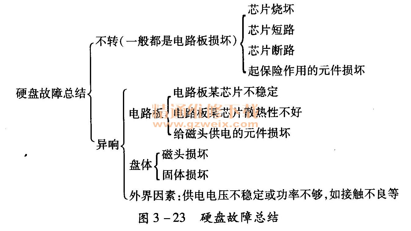 總結(jié):通地以上幾種常見硬盤故障檢修,可將所有硬盤硬件故障總結(jié)為圖3-23,這樣,當遇到硬盤硬件固降時,即可快速查找到故障部位。