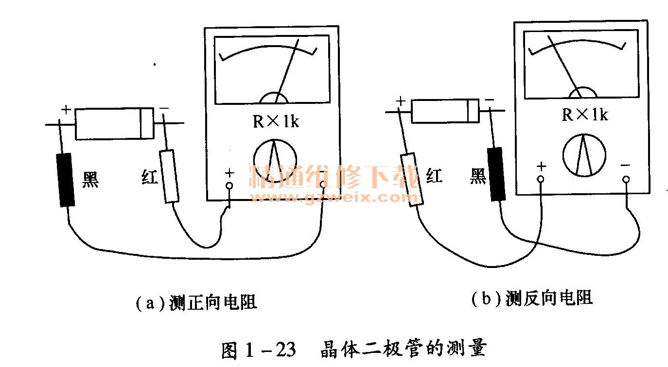 二極管的極性常用元件一側的色環(huán)來標志,帶色環(huán)的引出端為負極即N極,不帶色環(huán)的一側為正極即P極。可以用萬用表的R×100Ω、R×1kΩ擋測量。根據(jù)二極管單向導電特性,即正向電阻小,反向電阻大,用表筆分別與二極管的兩極相接,若紅表筆接二極管的正極(P極),黑表筆接負極(N極),電表所指示的阻值應大于100kΩ;若黑表筆接二極管的正極(P極),紅表筆接負極(N極),阻值應小于1. 5kΩ,此時黑表筆所接一端為二極管的正極(P極)。若二極和的反向電阻很小,則說明二極管短路;若正向電阻很大,說明二極管內(nèi)部斷路。這兩種情況都說明該二極管已損壞,不能使用,如圖1-23所示。