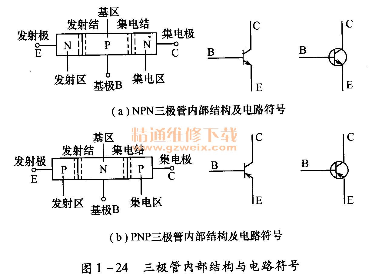 晶體三極管是由半導體材料制成兩個PN結。它的三個電極與管子內(nèi)部三個區(qū)----發(fā)射區(qū)、基區(qū)、集電區(qū)相連接。三極管有PNP型和NPN型兩種類型,其內(nèi)部結構與電路符號如圖1-24所示。