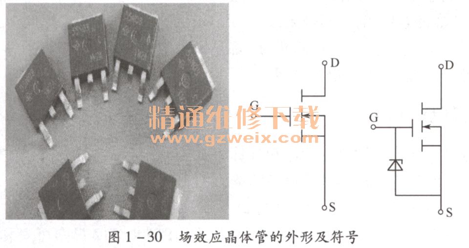 VMOS場效應晶體管是一種功率型場效應晶體管,全稱為V形槽MOs場效應晶體管,簡稱VMOS管,VMOS管有三個電極,分別為柵極G、漏極D和源極S。電路符號有兩種畫法,一種是內(nèi)藏保護二極管型,另一種是內(nèi)部不帶保護二極管型,分別如圖1-30所示。VMOS管的特點是具有V形槽和具有垂直導電性。漏極D是從芯片的背面引出的,因而工作時的漏極電流ID不是沿著表面水平流動,而是從重摻雜N+區(qū)(源極S)出發(fā),經(jīng)過與表面形成一角度的溝道流到輕摻雜N-漂移區(qū),然后垂直到達漏極D。因此,人們常把這種具有v形槽結構和垂直導電型的半導體器件統(tǒng)稱為V-MOSFET(垂直導電型金屬-氧化物-半導體場效應晶體管)。VMOS管具有輸入阻抗高、驅動電流小、耐壓高(最高耐壓1200 V)、工作電流大(1. 5A~100A)、輸出功率大(1W~250W)、跨導線性好、開關速度快等特點。