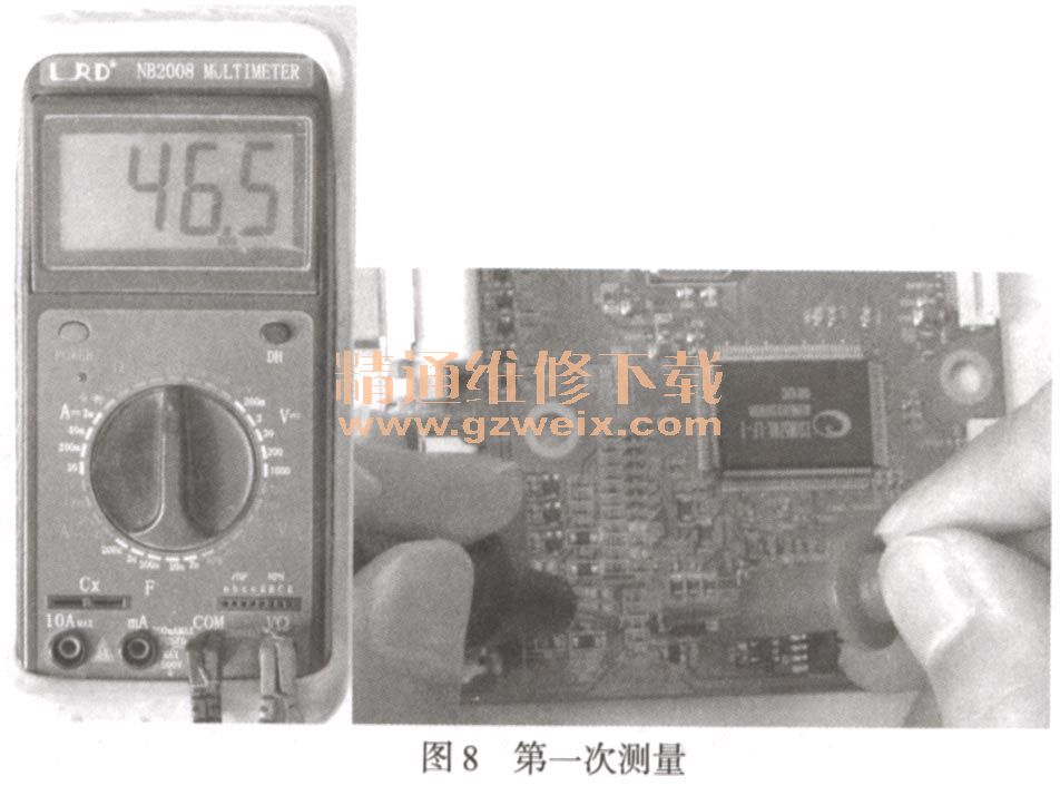 4.將萬用表的紅、黑色表筆分別搭在貼片電阻器兩腳的焊點(diǎn)上,觀察萬用表顯示的數(shù)值記錄測量值為46.5,如圖8所示。