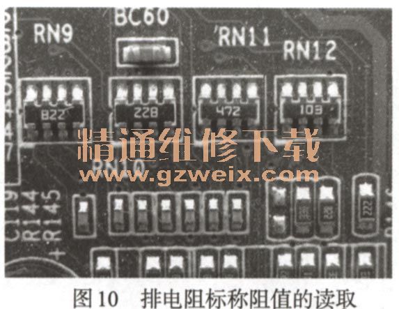 1.采用在路檢測方法檢測貼片排電阻器時(shí),首先要將排電阻器所在的供電電源斷開,如果是剛量主板CMOs電路中的排電阻器,還應(yīng)把CMOs電池卻下。對排電阻器進(jìn)行觀察,如果有明顯的燒焦、虛焊等情況,基本上可以鎖定故障了。如果待測排電阻器外觀上沒有明顯問題,根據(jù)排電阻的標(biāo)稱電阻讀出電阻器的阻值。如圖10所示,本次測量的貼片排電阻標(biāo)稱為103,即它的阻值為10k Ω,也就是說,它的4個(gè)電阻器的阻值都是10kΩ。