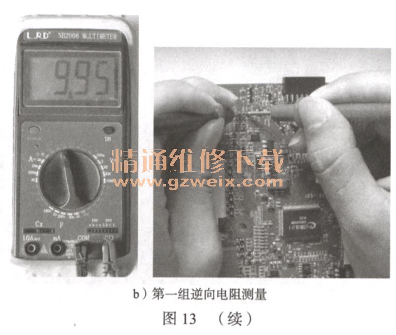 4.將萬用表的紅、黑色表筆分別搭在排電阻器第一組(將左側(cè)記為第一,然后依次排下去)對稱的焊點(diǎn)上觀察萬用表顯示的數(shù)值,記錄測量值9.94,接下來將紅、黑色表筆互換位置,再次測量,記錄第二次測量的值9.95,并取較大值作為參考,如圖13所示。