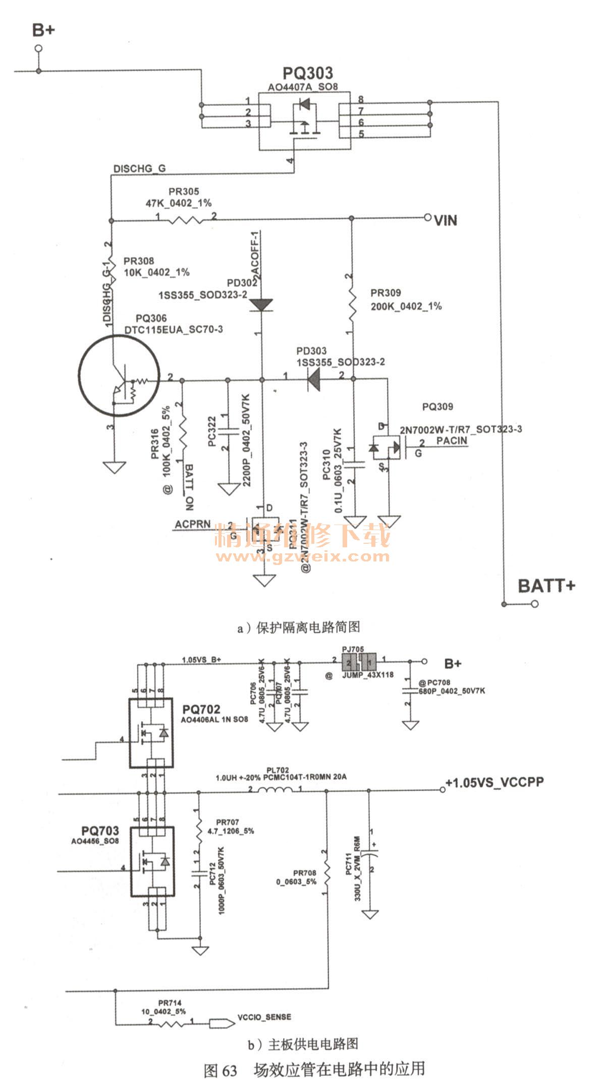 場(chǎng)效應(yīng)管屬于電壓控制型半導(dǎo)體器件,具有輸入阻抗高、噪聲小、功耗低、易于集成、沒(méi)有二次擊穿以及安全工作區(qū)域?qū)挼忍攸c(diǎn),常用于開(kāi)關(guān)及阻抗變換電路中。圖63a所示為保護(hù)隔離電路簡(jiǎn)圖,當(dāng)電路中的場(chǎng)效應(yīng)管PQ303在控制信號(hào)的控制下導(dǎo)通后,系統(tǒng)采用可充電電池供電。