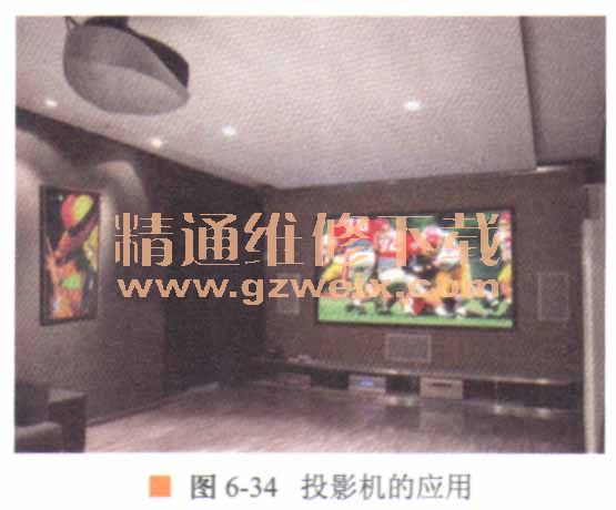投影機能連接有線電視或普通電視,直接接收多達100套電視節(jié)目,還可以接收DVD、VCD、LD等設備的視頻信號和計算機的數(shù)字信號。當與音響組合成多媒體家庭影院時,其視聽效果可以與真正的影院媲美,其應用如圖6-34所示。