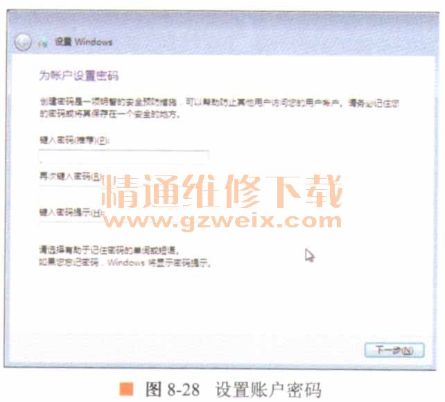 18.出現(xiàn)賬戶設(shè)置密碼窗口,在【鍵入密碼】文本框中輸入密碼,并在【再次鍵入密碼】文本框中再次輸入密碼,在【鍵入密碼提示】文本框中填寫密碼提示,然后單擊下一步按鈕,如圖8-28所示。