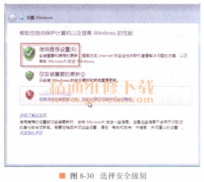 20.出現(xiàn)更新設(shè)置窗口,選中【使用推薦設(shè)置】選項(xiàng),Windows 7將自動安裝更新,如圖8-30所示。