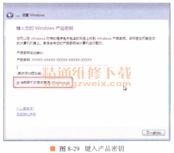 19.出現(xiàn)產(chǎn)品密鑰窗口,在【產(chǎn)品密鑰】文本框中輸入Windows 7旗艦版密鑰,選中【當(dāng)我聯(lián)機(jī)時自動激活Windows】復(fù)選項(xiàng),然后單擊匡奚垂習(xí)按鈕,如圖8-29所示。
