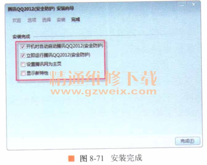 8.安裝完成后,選擇是否開機(jī)時(shí)運(yùn)行QQ程序或立即運(yùn)行程序選項(xiàng)等,最后單擊完成(F)按鈕完成安裝,如圖8-71所示。