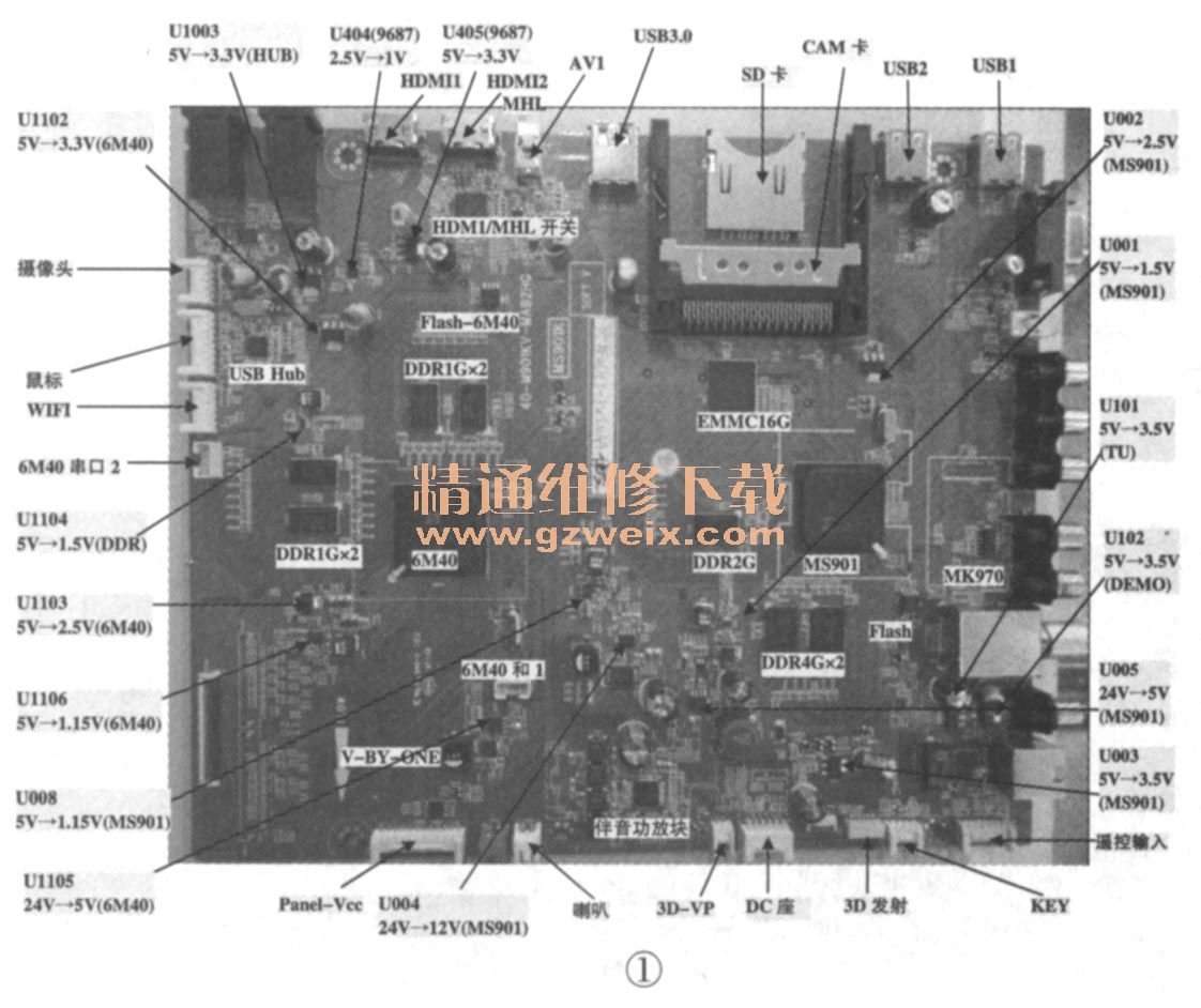 V8500系列使用MS901K機(jī)芯主板,該板除具有MS901板的所有功能外,還增加集成塊6M40及其升級(jí)串口,并增設(shè)了側(cè)置AV小板,支持VB1輸出或者120Hz LVDS信號(hào)輸出,如圖1所示。