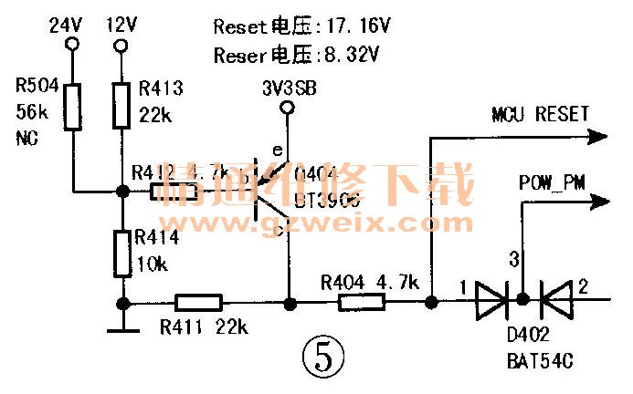 第二部分是掉電檢測(cè)復(fù)位電路,如圖5所示。其中一路參考電壓是STB3.3V,另外一路可以是24V(復(fù)位點(diǎn)電壓是17.16V),也可以是12V(復(fù)位點(diǎn)電壓是8.32V)。關(guān)機(jī)時(shí),STB3.3V是最后掉電的,先掉電的24V或12V電壓下降到一定程度時(shí)Q4喊導(dǎo)通,其c極輸出高電平復(fù)位信號(hào)。
