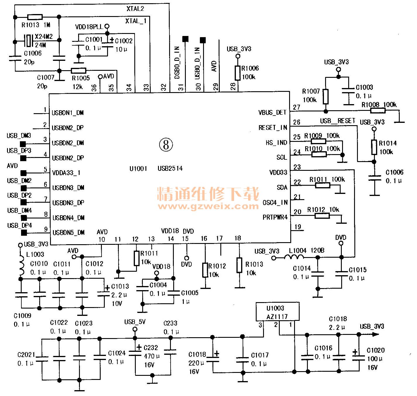 該機(jī)芯主板設(shè)有USB分時(shí)復(fù)用切換電路,如圖7所示,采用串行總線集線器U1001(USB2514),③、④腳及⑥~⑨腳為三路USB數(shù)據(jù)信號(hào)輸入接口(DM表示數(shù)據(jù)負(fù)信號(hào),DP表示數(shù)據(jù)正信號(hào)),由U1001進(jìn)行分時(shí)復(fù)用,如圖8所示。
