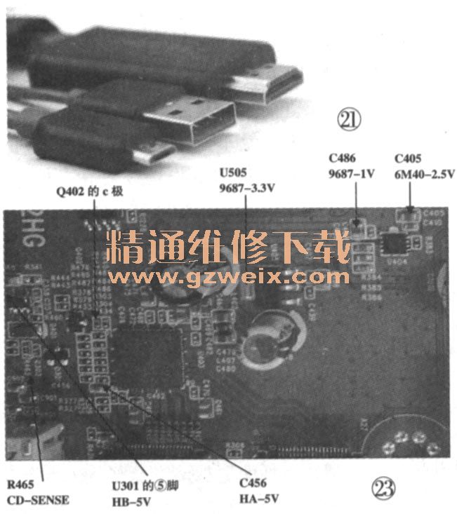 MS901K機芯彩申:的HDMI與MHL接口控制電路如圖22所示,關(guān)鍵實測點如圖23所示。當(dāng)外接HDMI信號時,+5V從接口進(jìn)入到SiI9687的R3PWR5V腳,然后從CBUS_HPD3端輸出響應(yīng)信號到相應(yīng)HDMI端口的HP-ET腳。在MS901機芯彩電中,因為沒有安裝有SiI9687芯片,HDMI 5V輸入后接入主IC的H3 DET腳,由I/O口對上拉到5V的H3_HPD_OUT進(jìn)行反相控制。
