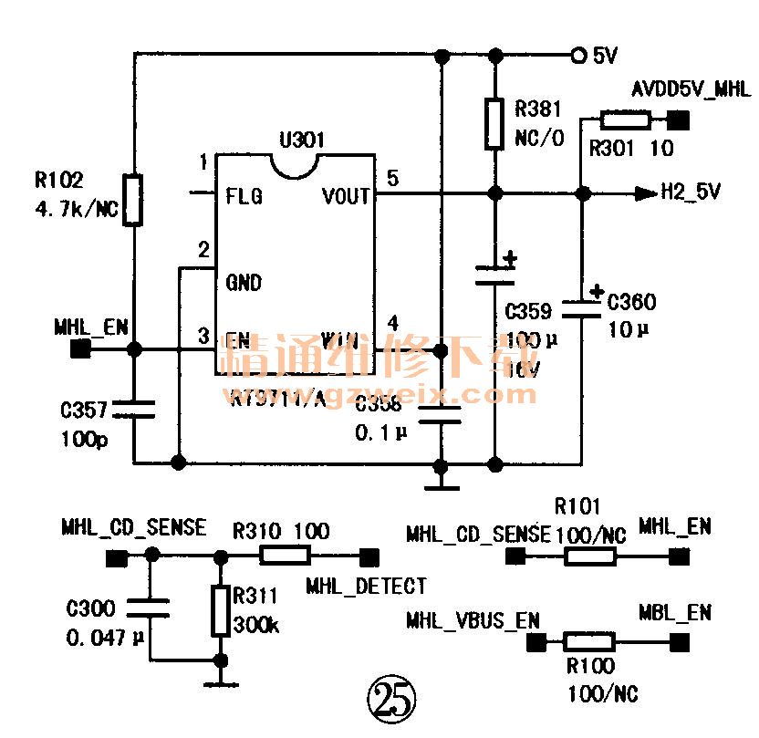 在MHL模式下,HDMI的18腳是沒有+5V電壓輸入的,接入的MHL連接線在HDMI的15腳及②腳間接入33kΩ電阻,上拉CD _sence腳,源極端通過CD _sense的下拉300kΩ電阻檢測到接收端Sink(接收端設(shè)備)的插人,CD_sense同時連接U301(RT9711 /A, Power Switch)的使能端③腳(高電平有效),如圖24所示,然后源極端會通過Sink設(shè)備的19腳C-BUS讀取Sink設(shè)備的EDID信息以確認(rèn)合適的分辨率輸出。