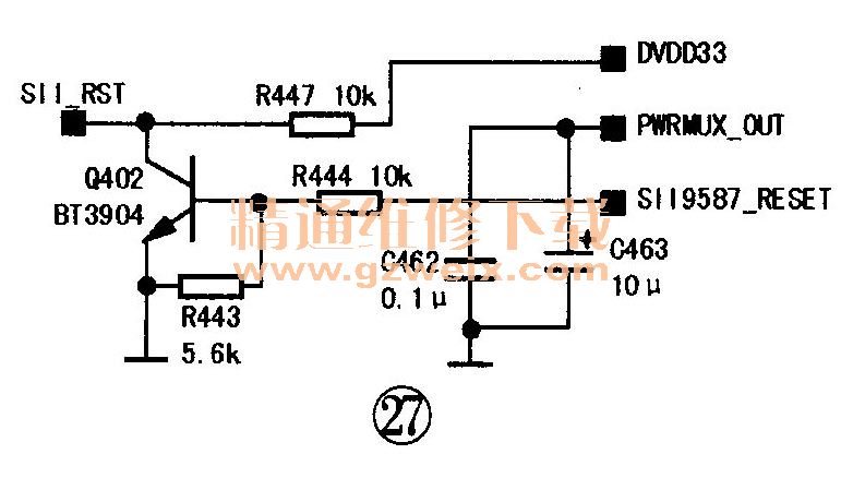 SiI9687外接復(fù)位電路,如圖27所示,低電平復(fù)位。SiI9687_RESET是由主IC I/O口直接控制的,需要復(fù)位時,系統(tǒng)拉高即可將SiI_RST拉低,復(fù)位結(jié)束后將Si-19687_RESET置低即可。實測該電路的復(fù)位波形如圖28所示,復(fù)位時間為21s。