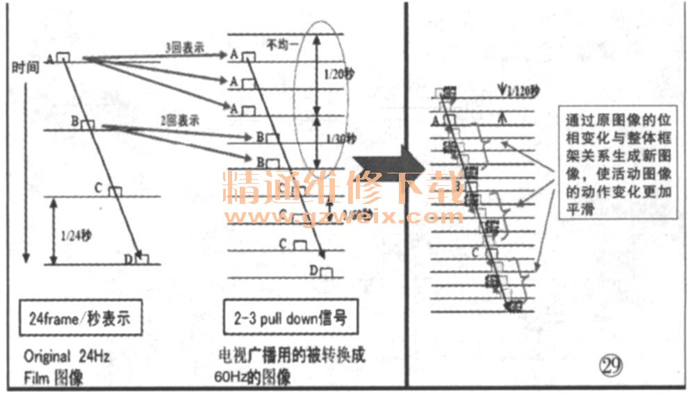 MEMC是Motion EstimateandMotion Compensation的縮寫,即運動估計和運動補償,是高端液晶電視常用的運動畫質(zhì)補償技術(shù),其原理是采用動態(tài)映像技術(shù),在傳統(tǒng)的兩幀圖像之間加插一幀運動補償幀,如圖29所示,這樣就可清除上一幀圖像的殘影,從而提高動態(tài)清晰度的效果,并將影像拖尾降至人眼難以感知的程度,使運動畫面更加清晰流暢。