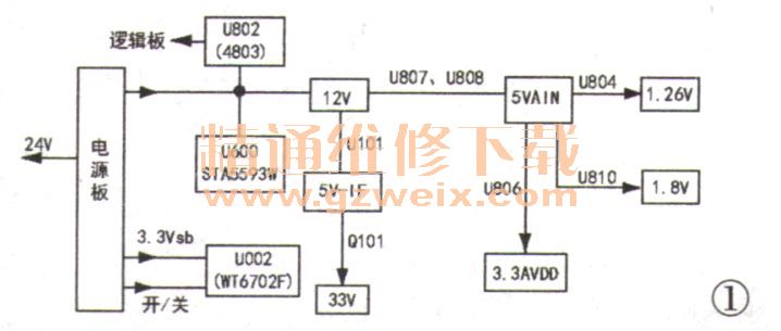 該機主板上電壓系統(tǒng)如圖1所示,電源板輸出3.3Vsb和12V兩組電壓到主板。3.3Vsb給U002(小CPU)供電,12V則分三路:第一路給數(shù)字伴音功放集成塊U600(STA5593W)供電,第二路去上屏電壓控制管U802(雙P溝道貼片場效應管4803),給邏輯板供電。第三路去DC-DC電路,下面重點分析DC-DC電路。