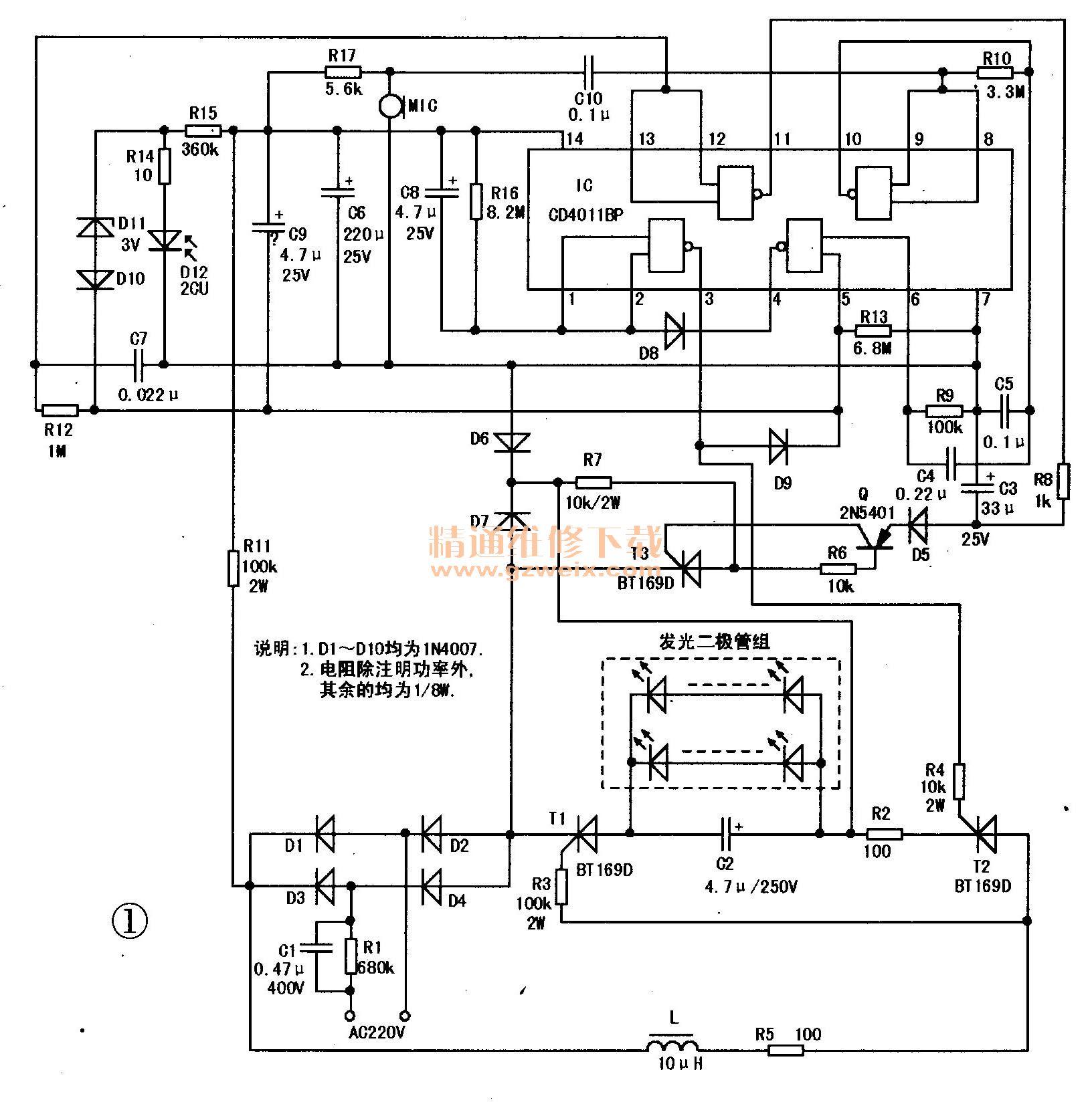 C3、D5、Q、T3、R7等元件的作用如下:在燈點亮,T3、Q導(dǎo)通后,C3上端電壓是上升的,這將產(chǎn)生兩種效果:一是經(jīng)R9使IC⑥腳變?yōu)楦唠娖剑员WC其對應(yīng)輸出端④腳繼續(xù)輸出低電平;二是經(jīng)R13、R12使IC的13、12腳為高電平,使其對應(yīng)輸出端11腳輸出低電平,讓Q、T3截止。在燈熄滅等待期間,由于IC11腳輸出的是高電平,故C3的上端(即IC⑦腳)電壓降低,經(jīng)R9使IC⑥腳為低電平,即保證輸出端④腳維持高電平。由此可見,這幾只元件具有適時配合調(diào)整IC⑥腳電平高低的作用,確保LED燈穩(wěn)定地點亮或熄滅。