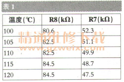 過熱保護:VREF,TSET腳的內(nèi)、外元件組成過熱保護電路,內(nèi)部設(shè)定的VREF(參考電壓)為1.227V、VREF端的最大輸出電流為100p,A。芯片內(nèi)部節(jié)點溫度保護閾值由電阻R7,R8的阻值決定,其對應(yīng)關(guān)系見表1。