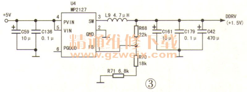 打印信息“DRAM loader config failed!!”提示DDR存儲器工作異常。首先測量DDR存儲器(K4B2G1646C)的DDRV(+1.5V)供電,竟不足1V。DDRV(+1.5V)電壓是+5V電壓經(jīng)DC-DC轉(zhuǎn)換器U4(MP2127)轉(zhuǎn)換獲得,如圖3所示。測量U4的輸入電壓正常,手摸U4表面溫度很低,故輸出過流嫌疑可排除,懷疑U4不良。將其換新后輸出電壓不變。接下來檢查輸出電壓取樣電阻R68、R70、R71,發(fā)現(xiàn)R68的阻值由22kΩ降至3kΩ(電阻值減)1、的故障實屬罕見)。將R68換新后試機,故障排除。