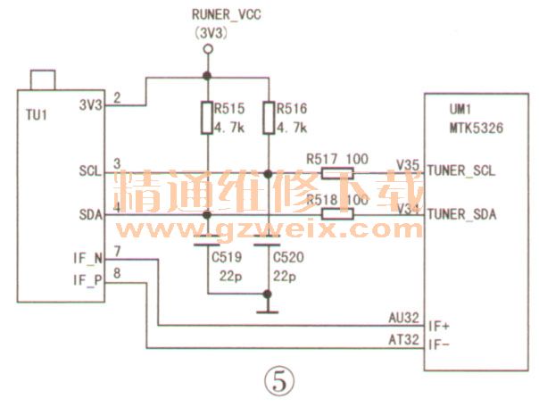 分析檢修:上電試機(jī),搜臺(tái)進(jìn)度指示條行進(jìn)速度很慢,懷疑主程序有問題,但升級(jí)后故障依舊。測(cè)量高頻頭各腳電壓,發(fā)現(xiàn)總線時(shí)鐘(TUNER_CLOCK)電壓只有1.3V(正常值約3V)。該機(jī)高頻頭的總線電路如圖5所示。斷開高頻頭③腳再測(cè),上拉電阻R516下端電壓仍為1.3V。在路對(duì)比測(cè)量R515、R516下端對(duì)地電阻,發(fā)現(xiàn)R516下端對(duì)地電阻明顯小于R515下端的對(duì)地電阻,懷疑電容C520(22pF)漏電。焊下C520檢測(cè),確已漏電。將其換新后試機(jī),故障排除。