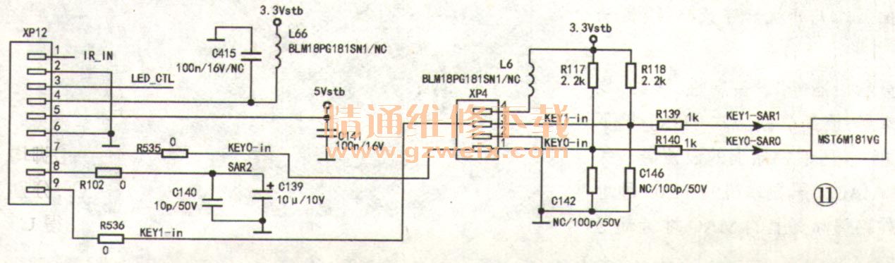 分析檢修:該機(jī)按鍵信號(hào)從插座XP12的⑦腳(KEY0)、⑨腳(KEY1)輸入,分別通過0Ω電阻R535、R536送給插座XP4的①、③腳,再分別通過1kΩ電阻R140、R139送給主芯片,如圖11所示。