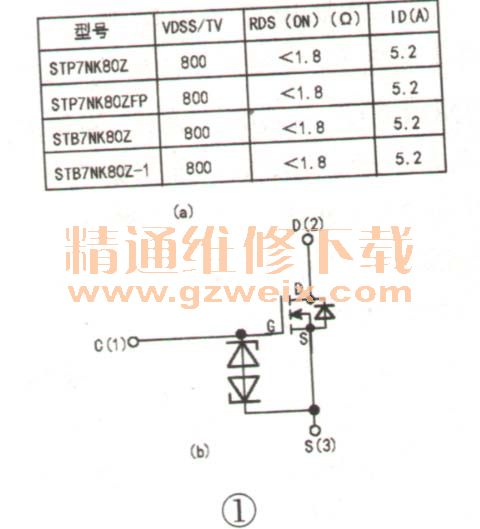 檢修提示:該顯示器原電源開(kāi)關(guān)管P7NK80ZFP內(nèi)部框圖及參考代換型號(hào)如圖1(a)、(b)所示。原電源IC為1200AP40,可用1200AP60參考代換。