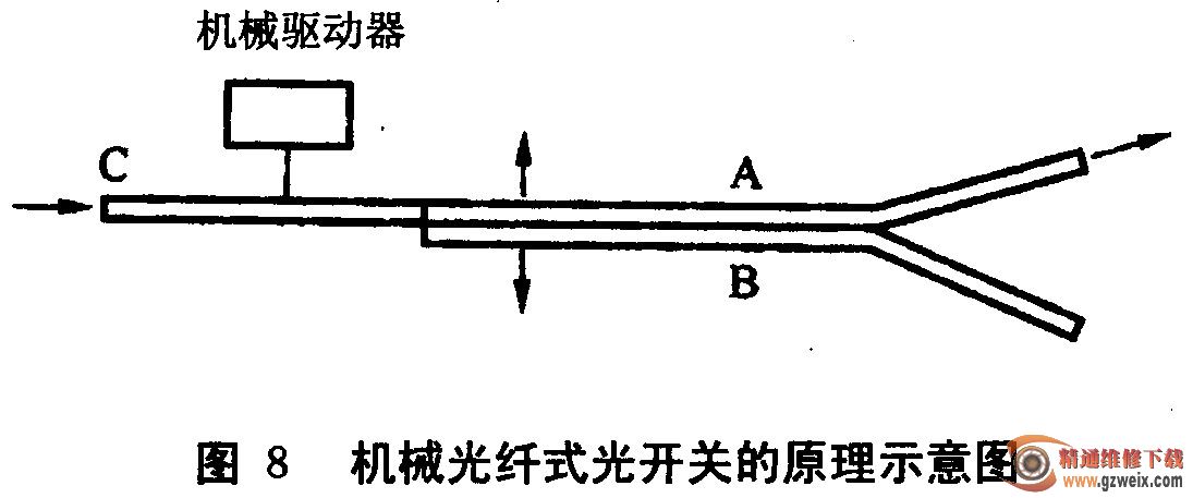 (3)集成波導式光開關(guān)的原理示意圖如圖8所示。它在LiNb03基片上用欽擴散的方法制成兩條靠得很近的光導波,并在上面蒸發(fā)上電極,在波導兩端口接入光纖,通過改變加在電極上電壓的大小,使端口1的入射光耦合入端口2或3,起到了開關(guān)作用。這種光開關(guān)的速度很快,但插入損耗為幾個分貝。