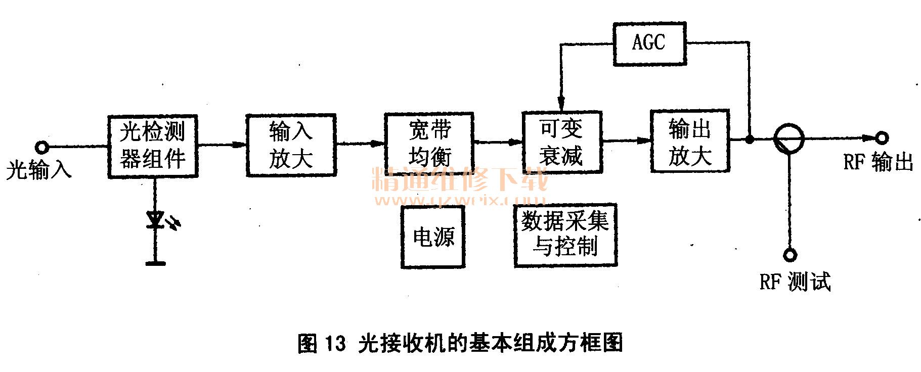 光接收機(jī)的作用是:把光纖傳送來的光信號(hào)轉(zhuǎn)換為電平合適、噪聲低、幅頻特性平坦的電視射頻信號(hào),送入電纜分配網(wǎng)絡(luò)進(jìn)行分配至電視用戶收看。光接收機(jī)分室內(nèi)型和室外型,兩者除供電方式不同外,工作原理基本上是一樣的。它主要包括光檢測(cè)器組件,輸入輸出放大器、均衡網(wǎng)絡(luò)、可變衰減器、自動(dòng)增益(AGC)控制、數(shù)據(jù)采集與控制和電源等部分。其組成方框圖如圖13所示。