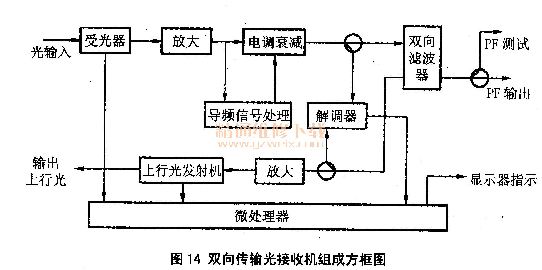 為了實(shí)現(xiàn)雙向傳輸,不少光接收機(jī)內(nèi)預(yù)留有上行光發(fā)射機(jī)安裝位置,安裝上行光發(fā)射機(jī)和雙向?yàn)V波器等器件后,可傳送上行信號(hào)。雙向傳輸光接收機(jī)組成方框圖如圖14所示?