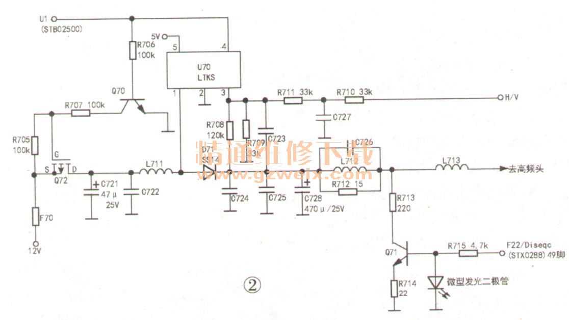 用于驅(qū)動(dòng)八切一切換開關(guān)的控制信號(hào)傳輸電路與高頻頭供電電路緊密相連,如圖2所示,受控的QPSK解調(diào)芯片STX0288經(jīng)其49腳輸出載有控制指令的22kHz脈沖信號(hào),經(jīng)Q71放大后調(diào)制到高頻頭供電電路。用手持式數(shù)字存儲(chǔ)示波器測量STX0288 49腳有22kHz脈沖信號(hào)波形輸出,但高頻頭供電輸出電路卻沒有22kHz脈沖信號(hào)波形,顯然故障發(fā)生在控制信號(hào)傳輸通道,再從控制信號(hào)傳輸通道后端向前檢查,測量Q71集電極有22kHz脈沖信號(hào)波形輸出,由此斷定R713已開路,換新后故障排除。