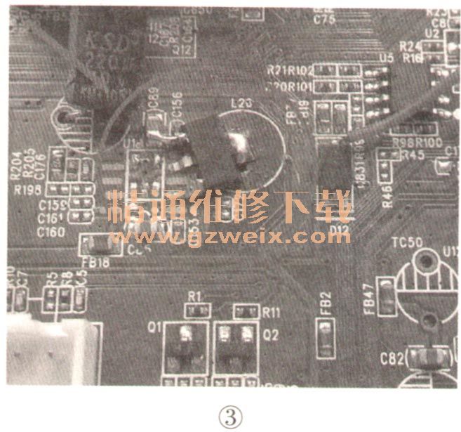 U1輸出電壓由③腳外接分壓電阻決定,計算公式為Vout-0.6以1+R1/R2),如圖2所示。拆下本機8204 (47M)和R205(10M)檢查阻值也正常,更換U1后故障依舊,判斷PCB板漏電。考慮到其他機器都是使用LDO芯片1117-3.3來提供+3.3V供電,于是筆者決定改動電路:拆除L26,按圖3所示焊好1117-3.3芯片,檢查無誤后通電試機,故障排除。后來又碰到幾臺同樣故障的機器,如法炮制后機器均正常工作。