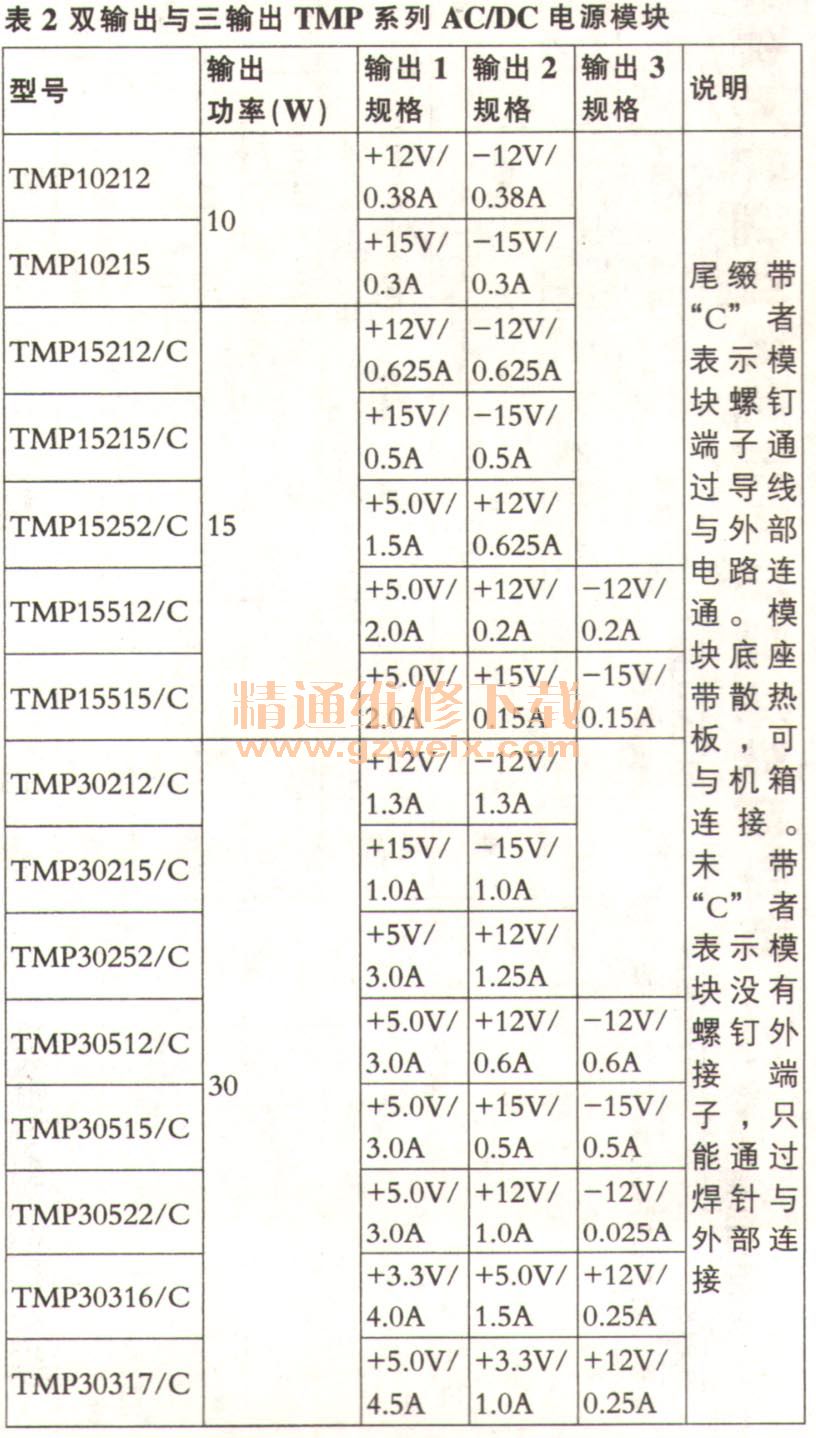 TMP系列AC/DC電源模塊是將交流電源輸入、變換和直流輸出完全塑封在一起的超緊湊電源器件,其顯著優(yōu)點是易于用螺絲與機(jī)箱固定安裝,或通過焊針直接與印刷電路板的銅箔焊接安裝,如圖1所示。這類電源模塊只有交流輸入和直流輸出端子,幾乎不需要外接元件,故為電子產(chǎn)品節(jié)約了大量空間。另外,由于它們性能優(yōu)異,且具有輸出過壓、過流及過熱保護(hù)功能,因而深受電子設(shè)備制造商青睞。表1、表2所列為TMP系列AC/DC電源模塊,輸入電壓范圍為AC85V~AC264V,頻率為47Hz~63Hz,DC輸出有單電源、雙電源及三電源三種規(guī)格。