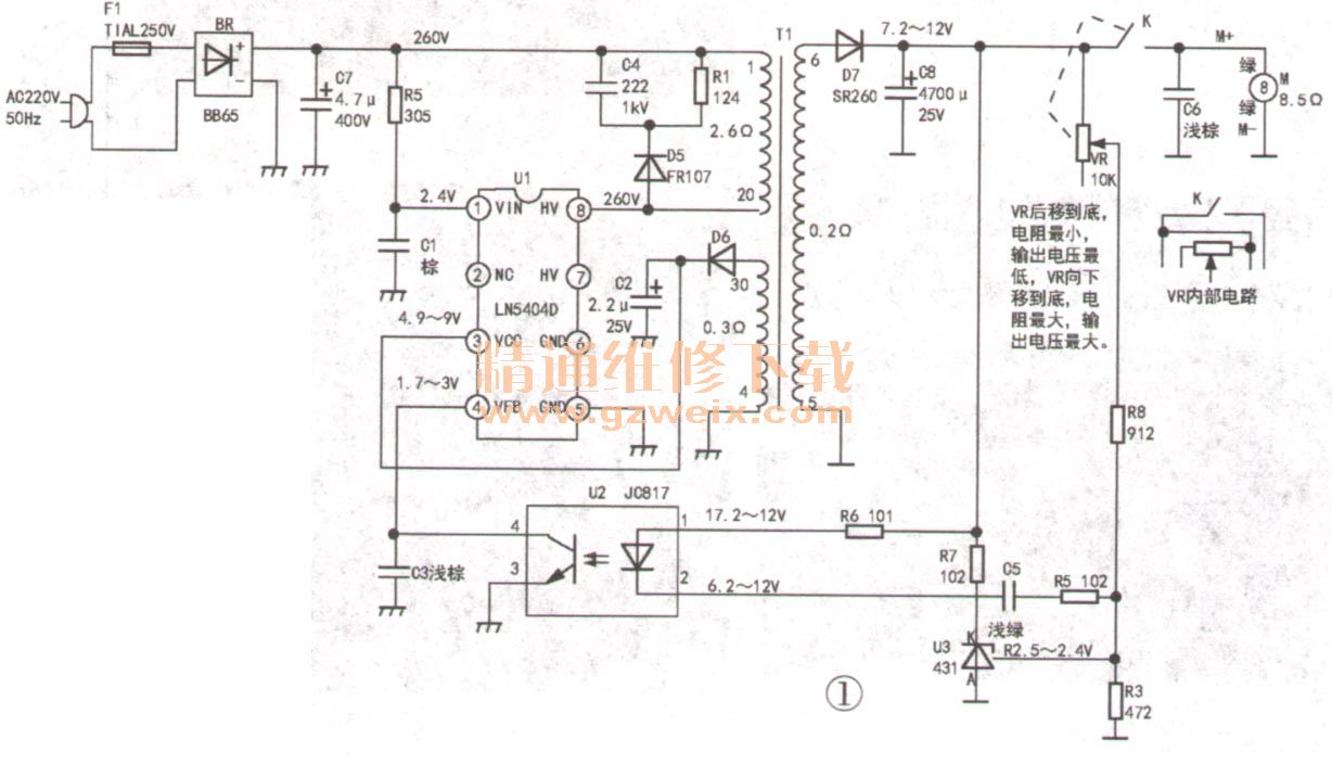 啟動后,T1的③~④反饋繞組感應(yīng)電壓經(jīng)整流管D6(玻璃二極管,無參數(shù),估計為1N4148)整流、C2濾波后,為U1的③腳VCC端供電,同時T1的⑥~⑤次級繞組感應(yīng)電壓經(jīng)整流管D7 (SR260)整流、C8濾波后,一路供直流電機(jī)M使用,一路送往由可調(diào)電位器VR、精密穩(wěn)壓器U3、光禍U2 (JC817)等元件組成的輸出電壓調(diào)整電路。調(diào)整信號經(jīng)U2的④-③繞組反饋至U1的④腳(VFB端),送給Ic內(nèi)部的PWM比較器,以調(diào)整輸出電壓高低,實現(xiàn)電機(jī)高低速轉(zhuǎn)動。