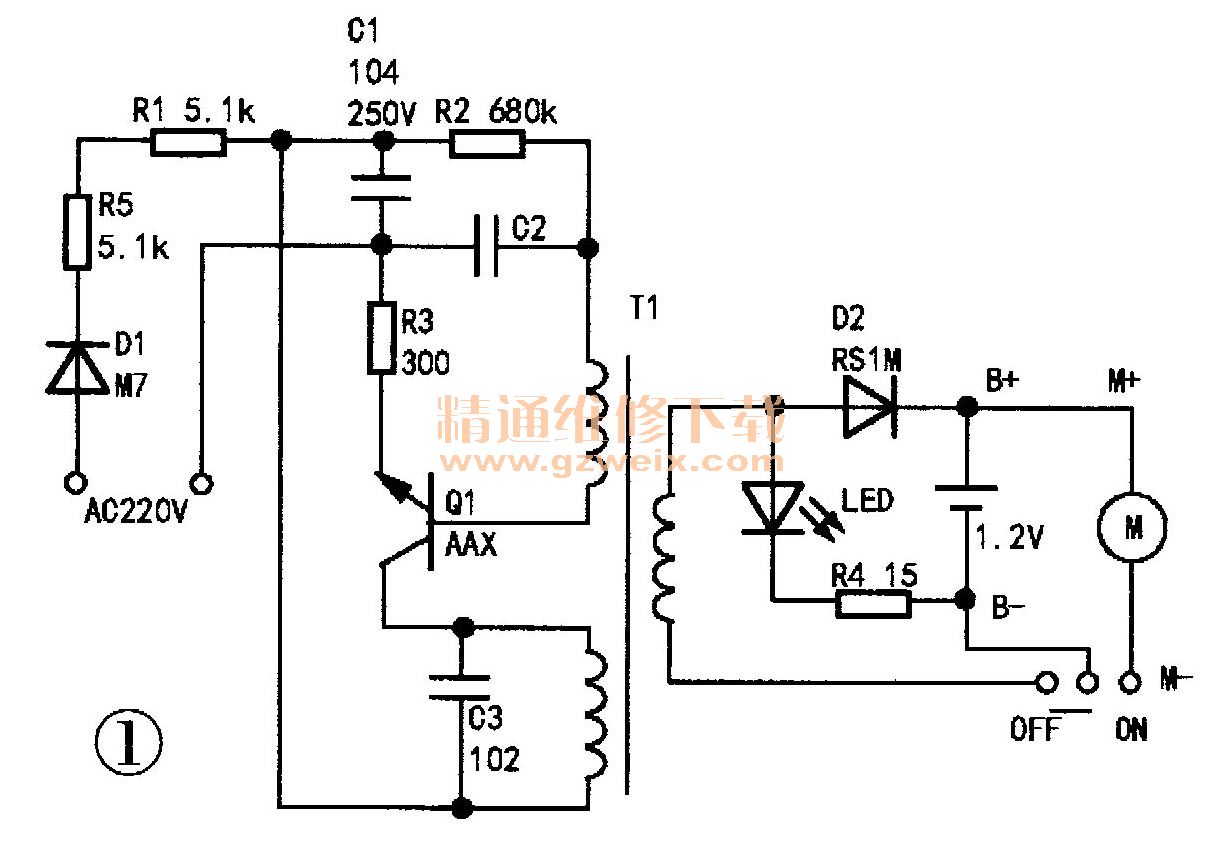 該機(jī)充電電路實(shí)際是簡(jiǎn)單的開(kāi)關(guān)振蕩AC-DC電壓轉(zhuǎn)換電路,如圖1所示。充電時(shí),220V交流市電經(jīng)D1整流、R5和R1降壓、C1濾波得到直流電壓,供給開(kāi)關(guān)振蕩電路。開(kāi)關(guān)振蕩電路正常工作后,微型鐵氧休變壓器T1的次級(jí)輸出脈沖低電壓,該電壓經(jīng)D2整流后為一只1.2V鎳鎬電池充電,此時(shí)剃須開(kāi)關(guān)置于OFF位置,充電指示燈應(yīng)點(diǎn)亮。從R5、R1損壞程度判斷,開(kāi)關(guān)振蕩電路可能存在短路故障,經(jīng)查Q1(AAX)已擊穿,R3也已斷路。用同阻值貼片電阻更換損壞的R5、R1、R3,用小功率節(jié)能燈塑封開(kāi)關(guān)三極管13003代換Q1,如圖2所示,通電測(cè)試,充電電路輸出電壓約為1.4V,此時(shí)綠色充電指示燈點(diǎn)亮。充電半日后,剃須刀運(yùn)轉(zhuǎn)正常。
