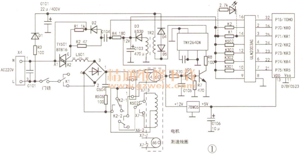 分析檢修:首先檢測電機(jī),各繞組和測速線圈均正常,手觸摸電機(jī)外殼,溫度也正常;檢測電腦板上的+12V和+5V正常,電機(jī)驅(qū)動(dòng)電路也正常。為確定故障是TY501未導(dǎo)通或K1未吸合所致,在全橋GR502的②腳(注:缺口處為①腳)與進(jìn)線N間接入1只220 V燈泡(稱A燈),在GR502的③腳與進(jìn)線L間接入1只220 V燈泡(稱B燈)。開機(jī),電機(jī)運(yùn)轉(zhuǎn),2只燈均發(fā)光。工作一段時(shí)間后,A燈熄滅,一會(huì)兒后B燈熄滅,電機(jī)停轉(zhuǎn),面板顯示"Err7",由此判斷K1觸點(diǎn)不良或其驅(qū)動(dòng)電路有故障。