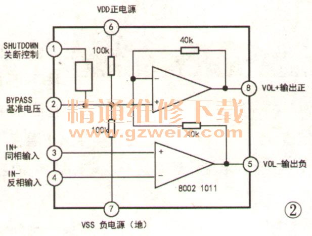 由實(shí)物測(cè)繪的電路如圖1所示。IC1、IC2是兩只型號(hào)為“8002 1011”的貼片式音頻功放集成電路,采用SOP-8雙列扁平封裝,其內(nèi)部結(jié)構(gòu)框圖如圖2所示。它屬橋接BTL式功放電路,省卻了自舉、緩沖、消振等外圍元件,還能在5V低電壓條件下獲得較大功率輸出。當(dāng)負(fù)載為4Ω時(shí)輸出功率為Pn=2.5W; 8Ω時(shí)Pn=1.5W。其第一個(gè)放大器增益可由外部元件設(shè)定,第二個(gè)放大器增益是固定的,兩個(gè)放大器輸出的信號(hào)數(shù)量相同,但相位相反,兩個(gè)信號(hào)相加輸出,因而增大了信號(hào)輸出功率。IC工作電壓為DC2.0V~5.5V,對(duì)應(yīng)的靜態(tài)電流為6.5mA~12mA。由于該芯片具有以上優(yōu)點(diǎn),目前已被廣泛運(yùn)用于手提、臺(tái)式電腦、MINI音響、學(xué)習(xí)機(jī)、游戲機(jī)等數(shù)碼產(chǎn)品中。