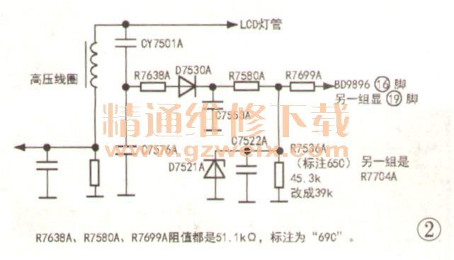 后來又遇一臺(tái)該型機(jī)冷開機(jī)背光一亮即滅故障,在網(wǎng)上找到該機(jī)型解決辦法:把IR7536A和R7704A電阻從原來45.3kΩ(電阻表面標(biāo)注64C)改為39kΩ,按實(shí)物畫出相關(guān)電路(有兩組完全相同的電路,R7704A在另一組),如圖2所示。高壓變壓器輸出的高壓經(jīng)CY7501A和C7576A分壓后,經(jīng)D7530A整流、C7553A濾波,形成高壓檢測(cè)電壓VS,再經(jīng)R7580A和R7536A分壓后,送到BD9896的16腳(VS檢測(cè)端)。冷開機(jī)時(shí),燈管兩端電壓較高,VS電壓超過BD9896的保護(hù)值,背光停止工作。雖然把R7536A和R7704A阻值改小,可以降低VS電壓,使背光點(diǎn)亮,但是這兩只電阻不能取值過小,因?yàn)楸彻庑酒腣S檢測(cè)腳有一個(gè)正常工作范圍,當(dāng)高于其上限時(shí),芯片判斷為輸出高壓過高或燈管開路(低于其下限,則判斷為輸出高壓過低或負(fù)載過重),使背光芯片停止工作。通過實(shí)驗(yàn),這兩只電阻的阻值比原電阻減小10%~20%均可。