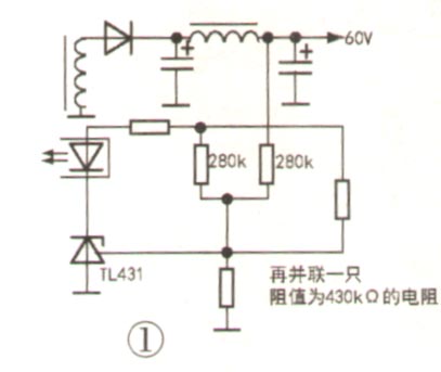 一是適當(dāng)降低背光供電電壓。該機(jī)背光供電是60V,其穩(wěn)壓線路簡(jiǎn)圖如圖1所示。原來的取樣電阻是由兩只280kΩ電阻并聯(lián)的,在這兩只電阻上再并聯(lián)一只430kΩ的電阻,輸出電壓降為55V(不能再降低了,因?yàn)楸彻怆娐酚泄╇婋妷罕O(jiān)側(cè),低于一定值后背光不工作)。