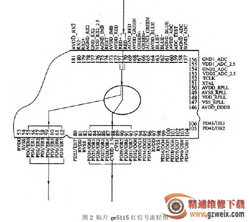 (3)分析、檢修多引腳貼片集成電路時(shí),抓住關(guān)鍵的信號流:信號流主要是指信號從集成電路相應(yīng)腳輸入,從對應(yīng)腳輸出,內(nèi)部怎樣處理可以不去考慮,只是抓住信號流流入、流出是否正確、大小、有無等。gm5115 紅信號流徑如圖 2 所示。