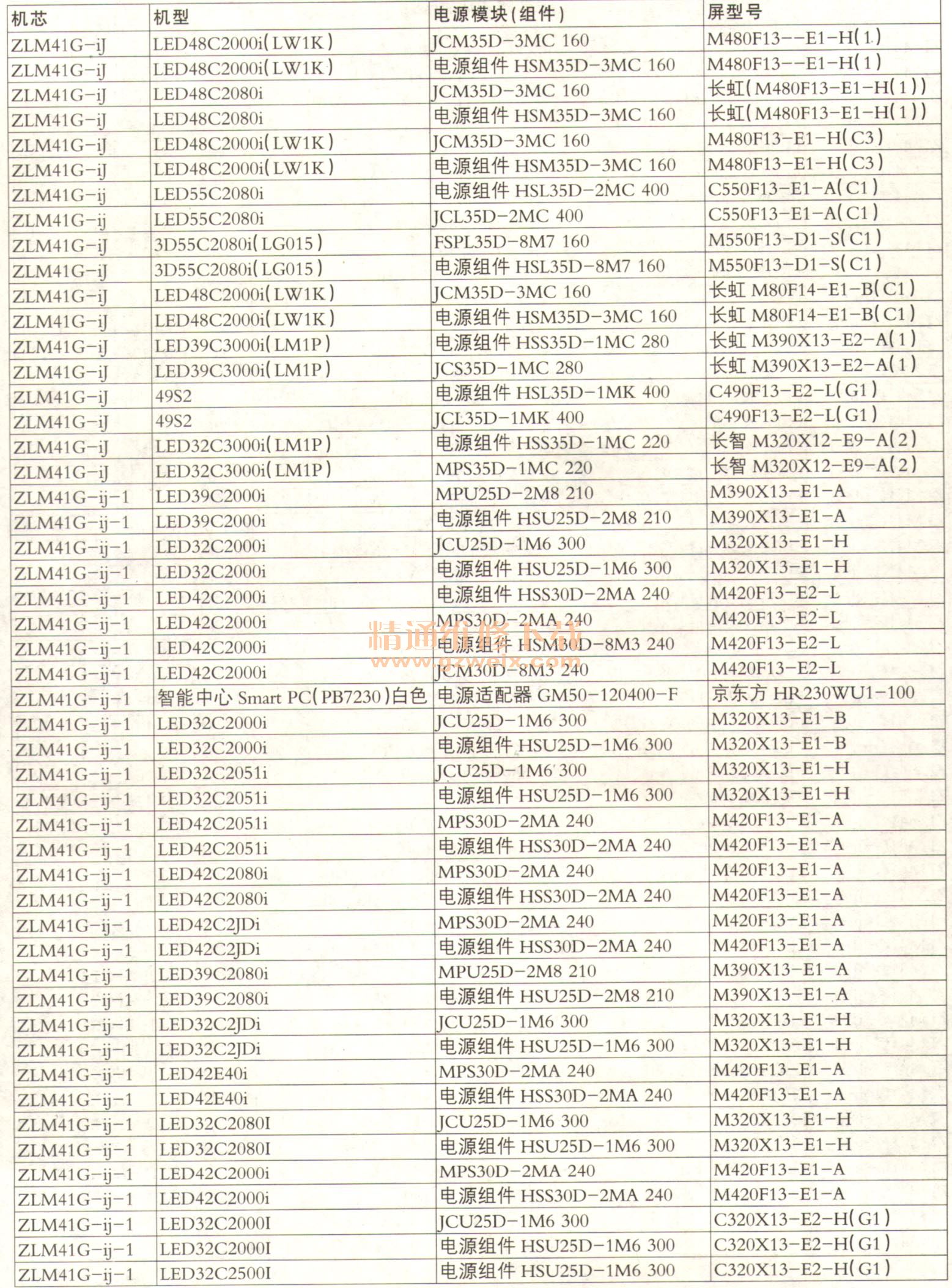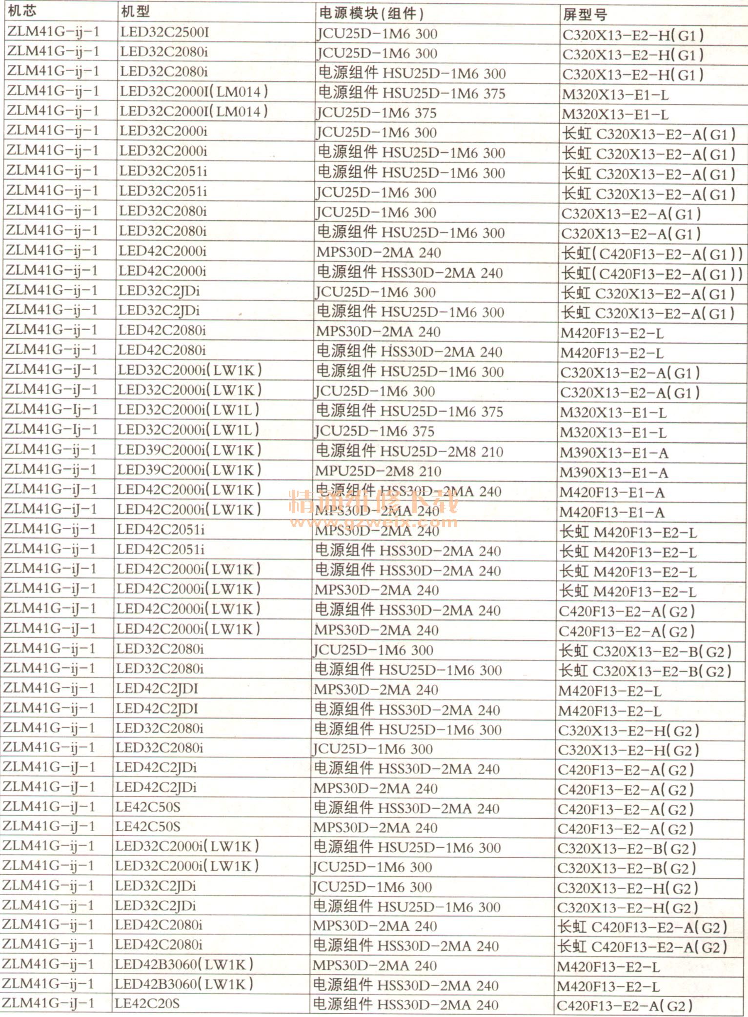 長(zhǎng)虹平板彩電機(jī)芯機(jī)型對(duì)應(yīng)電源組件、屏速查表(九)