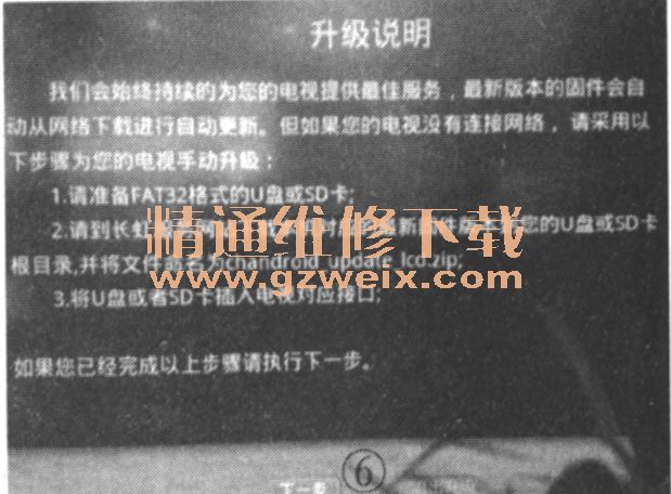 步驟2:選擇手動(dòng)升級(jí),確定后,出現(xiàn)升級(jí)說明菜單。直接點(diǎn)擊下一步,電視機(jī)自動(dòng)檢測(cè)U盤里面的升級(jí)軟件包,見圖11。