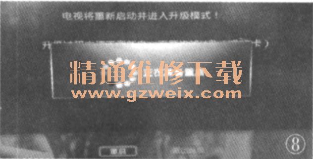 點(diǎn)擊升級(jí),電視機(jī)出現(xiàn)提示信息“電視機(jī)將重新啟動(dòng)并進(jìn)入升級(jí)模式。升級(jí)過程中請(qǐng)不要斷電,不要拔掉U盤(或SD卡)”字樣,此時(shí)點(diǎn)擊重啟按鍵,電視機(jī)準(zhǔn)備重新啟動(dòng)。同時(shí),電視機(jī)關(guān)機(jī)并重啟,進(jìn)入升級(jí)狀態(tài),見圖8。