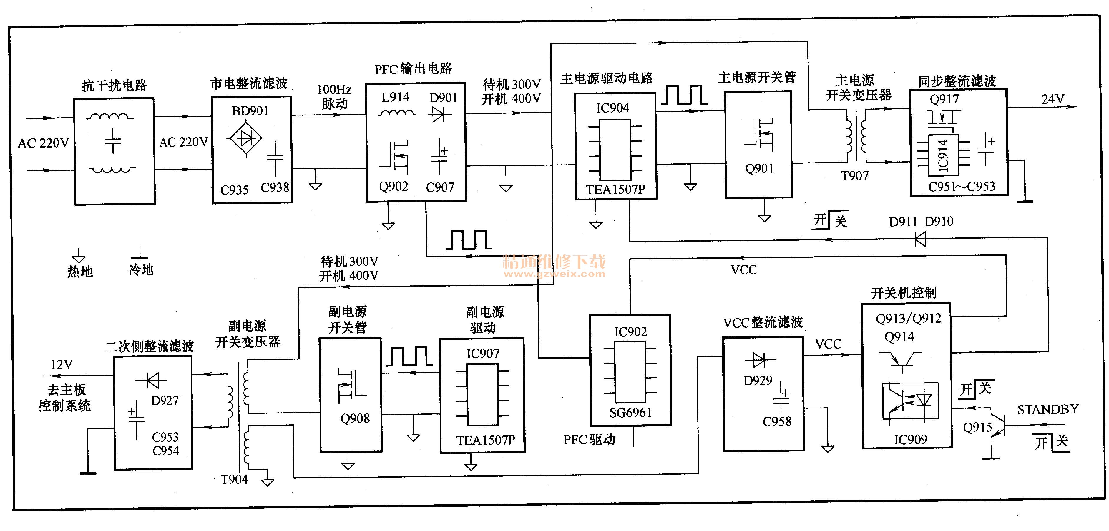 該電源板由三部分組成:一是以集成電路SG6961(IC902)為核心組成的PFC電路,將整流濾波后的市電校正后提升到400V為主、副電源供電;二是以集成電路TEA1507P(IC907)為核心組成的副電源,產(chǎn)生12V電壓,送到主板降壓后為主板控制系統(tǒng)供電;三是以集成電路TEA1507P(IC904)為核心組成的主電源,產(chǎn)生24V電壓,為主板和逆變器板供電。