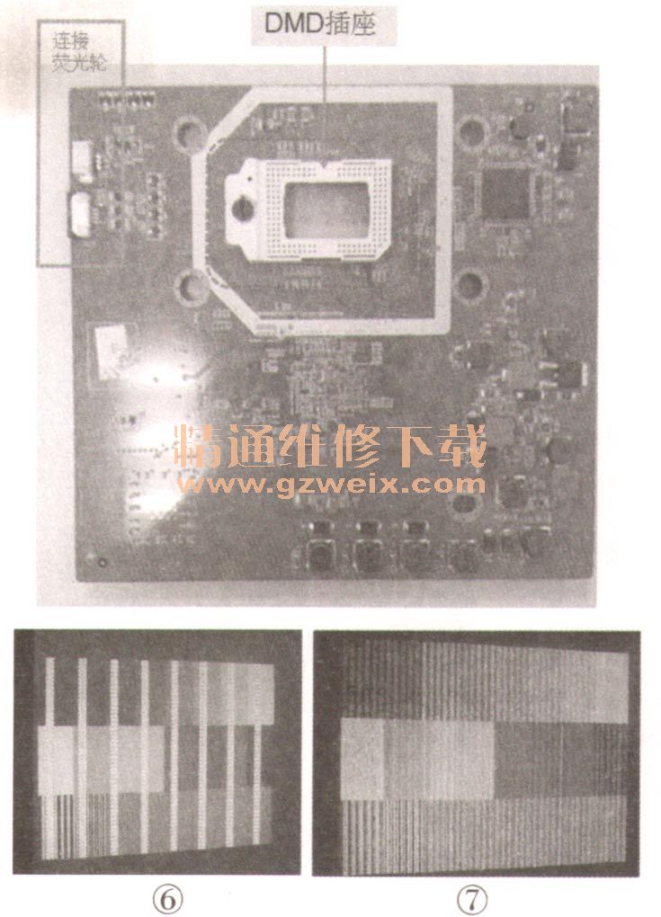 分析檢修:開機(jī)后聽色輪有無轉(zhuǎn)動(dòng)聲,如果無,則表明色輪完全不轉(zhuǎn),這時(shí)需檢查DLP驅(qū)動(dòng)板上的12V、1AV、1.8V、2.5V、3.3V、5V等電壓是否正常,如果不正常,則查相關(guān)電壓形成電路及負(fù)載;如果都正常,則取下DMD芯片再重新安裝。注意:嚴(yán)禁帶電拆裝DMD芯片,否則會(huì)導(dǎo)致電路損壞!