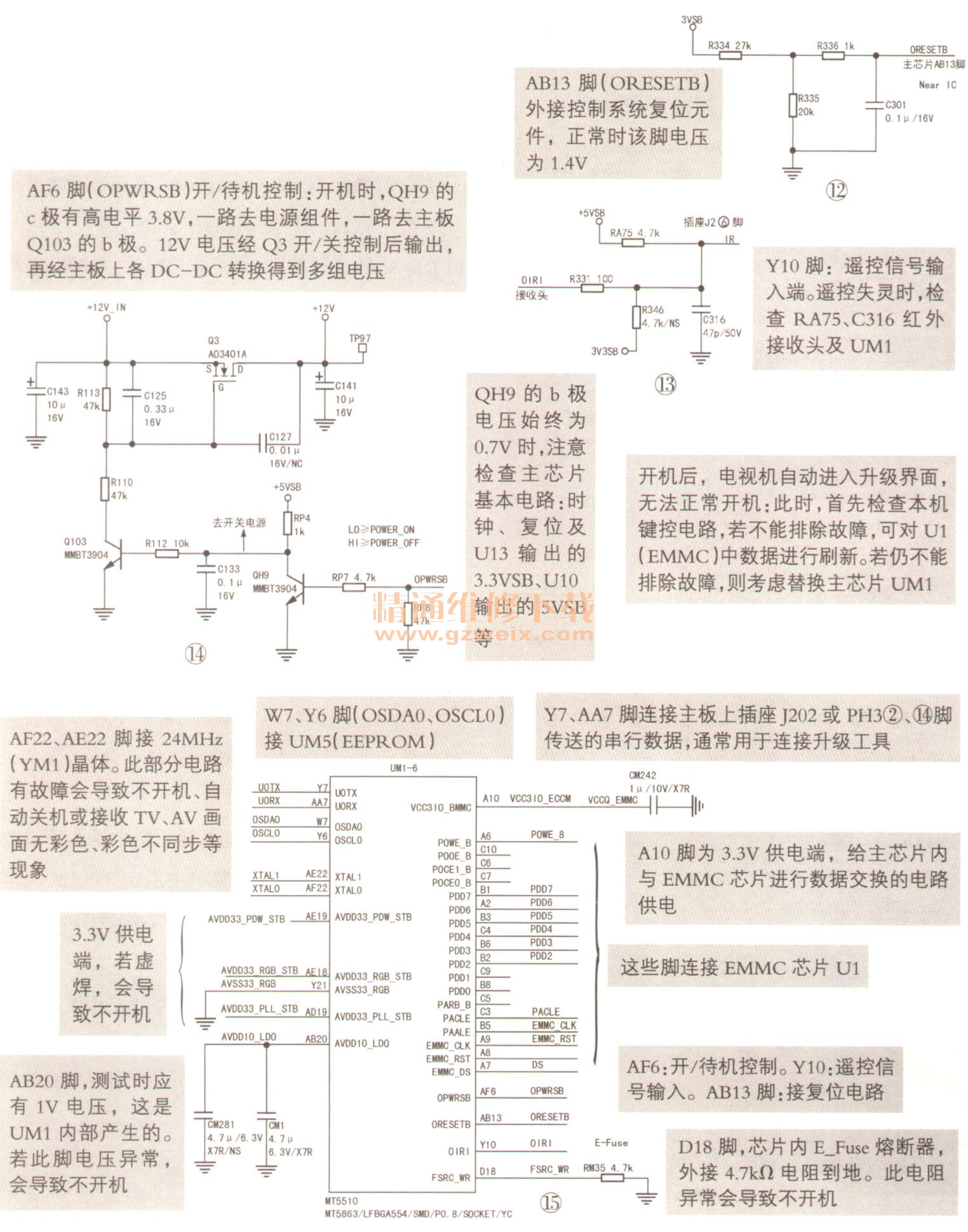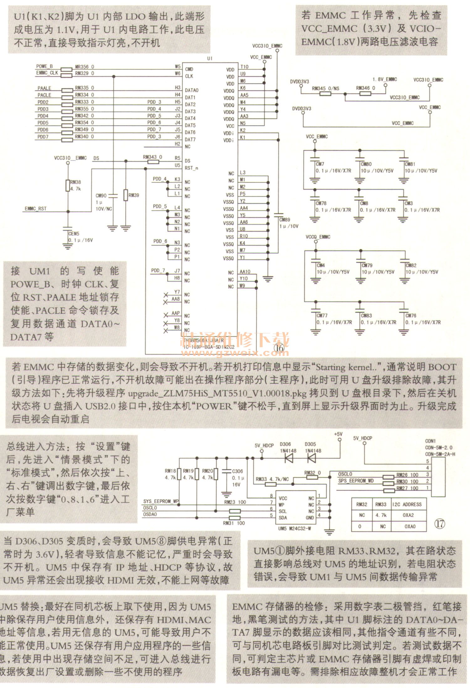 此機(jī)芯控制系統(tǒng)由UM1與外掛的EMMC芯片U1和UM5等電路組成,與控制系統(tǒng)相關(guān)的電路如圖12~圖17所示。