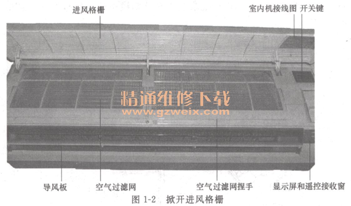 捏住空氣過濾網(wǎng)的捏手向下拉,就可抽出空氣過濾網(wǎng),露出室內(nèi)熱交換器,如圖1-3所示。