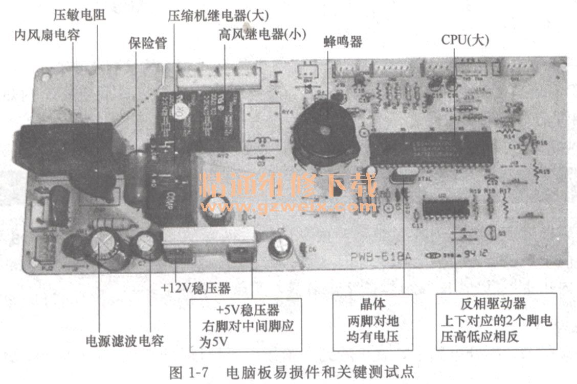 圖1-7是電腦板上的易損件和測試關(guān)鍵點(diǎn)。電腦板是整機(jī)的控制核心。通電就啟動工作,開始接收用戶指令,當(dāng)接收到開機(jī)指令時(shí),接通相應(yīng)繼電器觸點(diǎn),啟動壓縮機(jī)、內(nèi)外風(fēng)扇電機(jī)、導(dǎo)風(fēng)電機(jī)運(yùn)轉(zhuǎn),空調(diào)器開始運(yùn)轉(zhuǎn)制冷。
